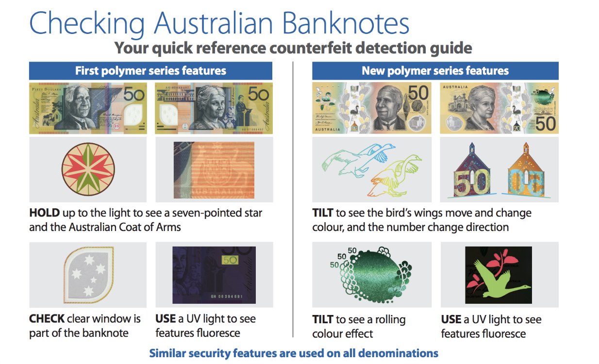 The RBA website has some good information for businesses and residents on how to spot a fake note here.