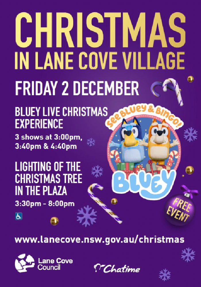 Bluey and Bingo are coming back to Lane Cove, and there will also be the popular lighting of the Christmas Tree in the Lane Cove Plaza (it has been scaled down for the last couple of years, but before 2020 it was always one of Lane Cove’s popular events)