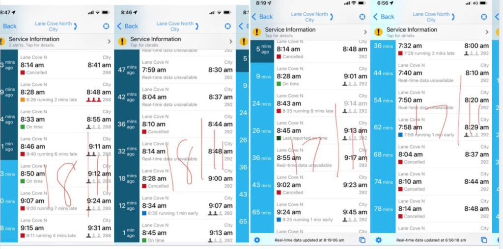 See below an example provided to us for this week for the 292 and 288 in the morning peak period. Note there has been regular cancellations even before the new COVID19 wave (see more below).