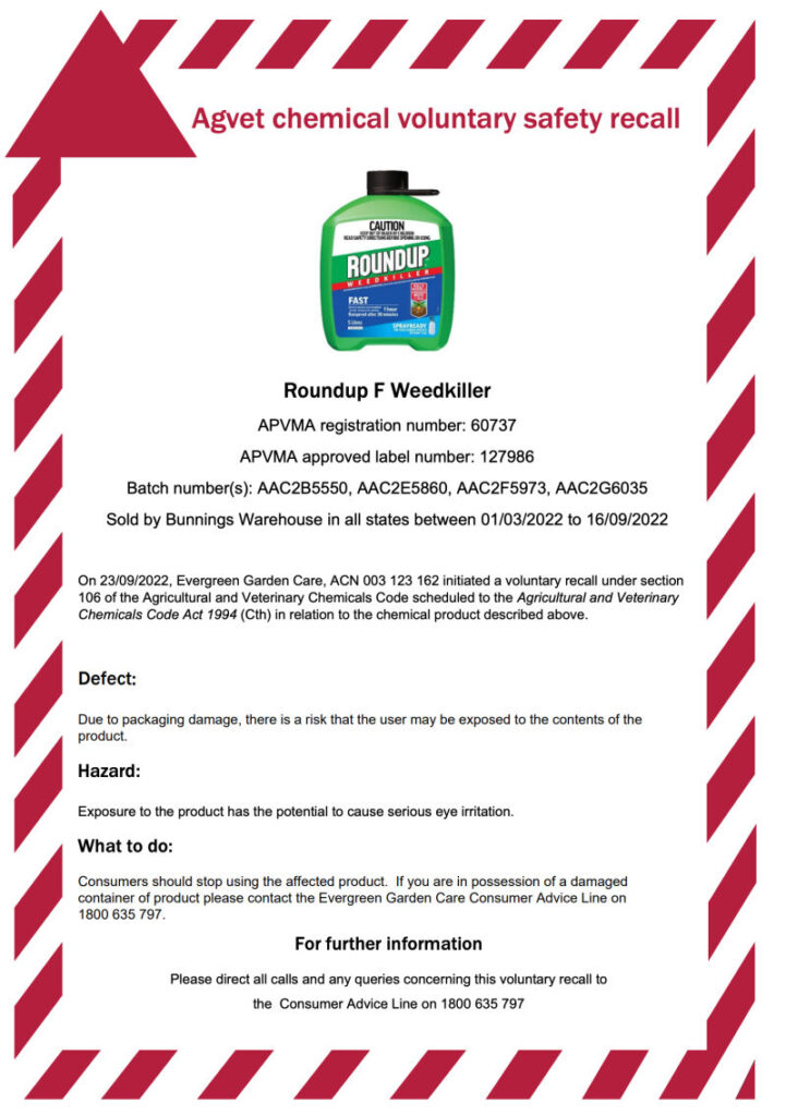 An urgent recall has been issued for RoundUp, one of Australia’s most popular weedkiller products.