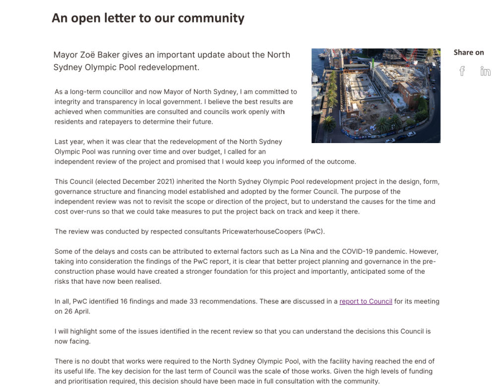 It will be interesting to see how councillors vote on this resolution. Since their last meeting North Sydney Council has released the results of a Price Waterhouse Coopers report on the significant cost overruns associated with the North Sydney Pool Redevelopment Project. Mayor Zoe Baker wrote an open letter to residents which you can read here.