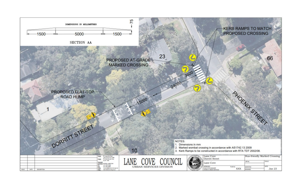 • An at-grade marked pedestrian crossing on Dorritt Street at Phoenix Street, western approach. The pram ramps on both ends will match the new crossing.