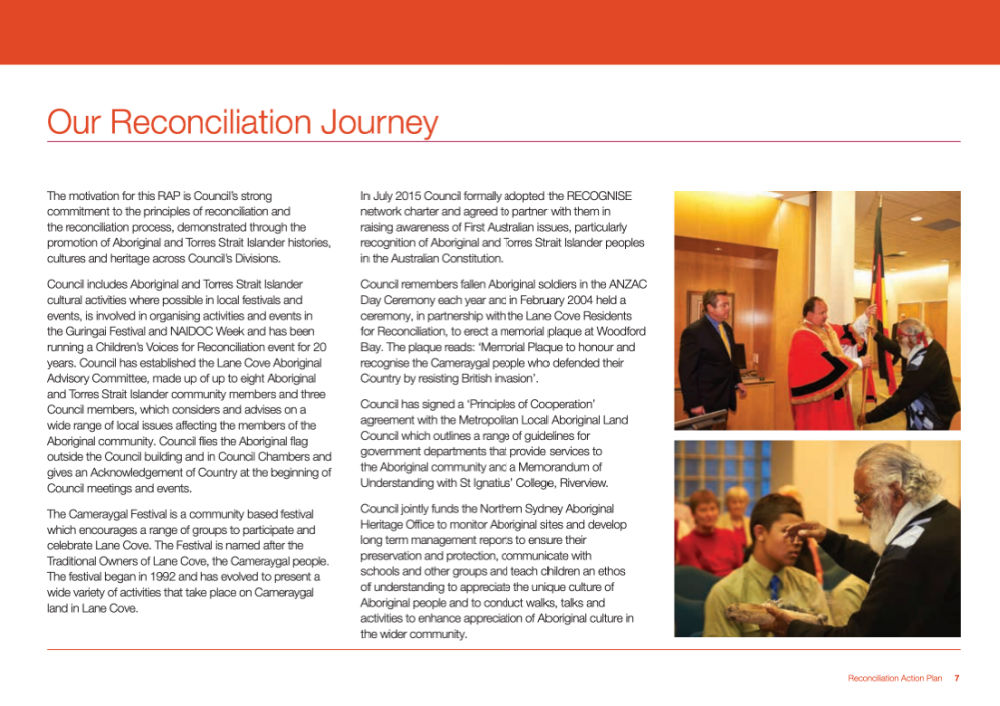 Lane Cove Council adopted the Lane Cove Council Reconciliation Action Plan in August 2016 (RAP).