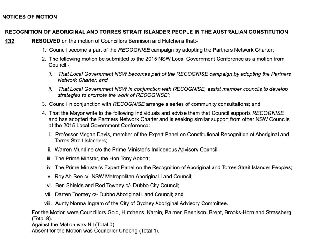 Six Councillors have tabled a notice of motion recommending Lane Cove Council affirms its support for constitutional recognition for Aboriginal and Torres Strait Islander people through a Voice to Parliament