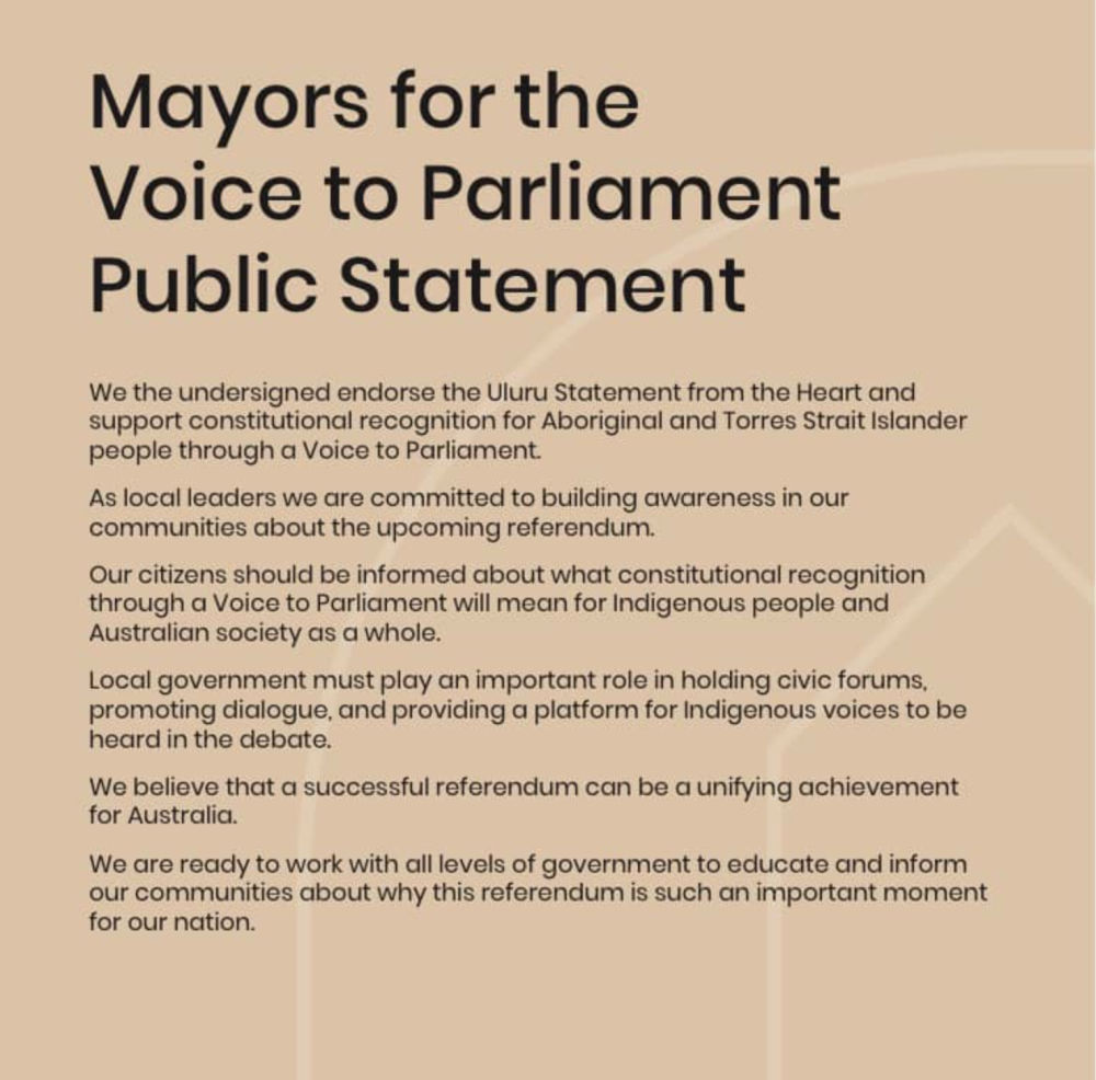 In December 2022, Mayor Andrew Zbik joined with 37 Mayors across Australia in a joint statement, Mayors for the Voice to Parliament Public Statement, in support of constitutional recognition for Aboriginal and Torres Strait Islander people through a Voice to Parliament.