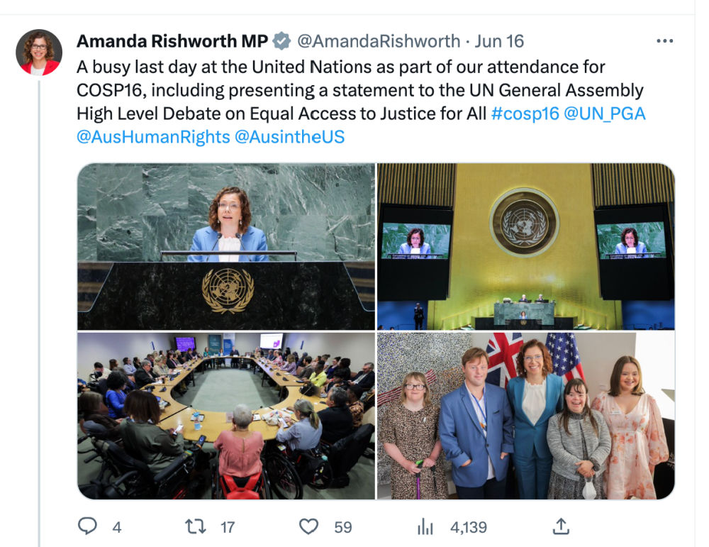 The COSP provides an opportunity for Australia to engage in dialogue with other nations and connect individuals and organisations with best practice ideas around mechanisms to secure and advance the rights of persons with disabilities.