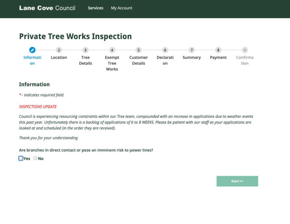 If you have a tree that needs pruning or removing, be aware that there is a backlog at Lane Cove Council – below appears when you start the process of logging a tree request online.