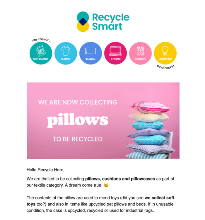 Pillows are so hard to recycle. Not any more; RecycleSmart is now collecting pillows. Find out here the other hard-to-collect items they pick up from your home.