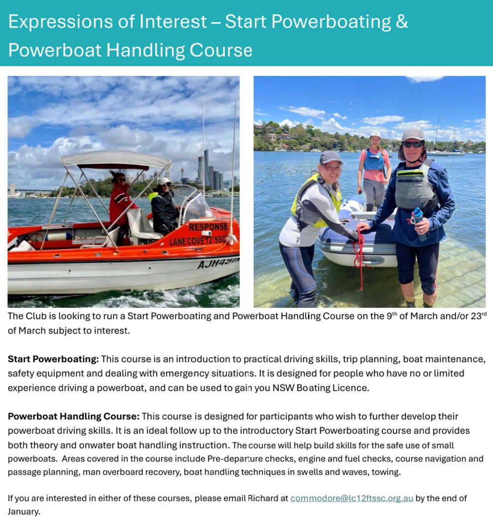 Lane Cove 12ft Sailing Skiff Club is seeking expressions of interest for two courses, Start Powerboating and Powerboat Handling. See the flyer below for details. Contact Commodore Richard Kornman via [email protected] for questions and to register.