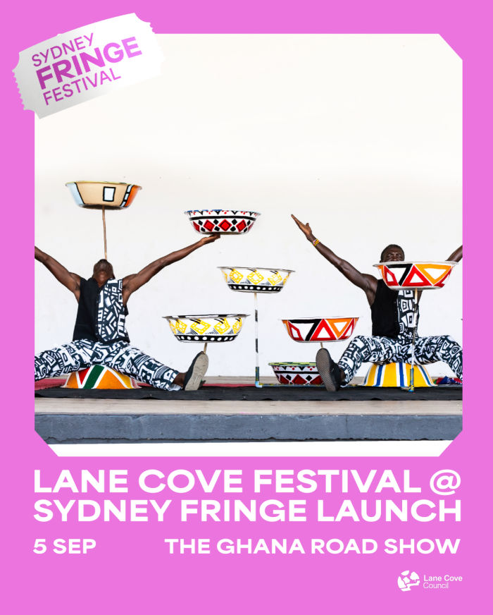 The Ghana Road Show is a vibrant fusion of circus, dance, music, and visuals—celebrating West African culture with bold storytelling, electrifying talent, and joyful energy. A powerful, contemporary performance experience. Lane Cove locals will have the opportunity to preview this incredible show. Book here – it is located in the Sydney Fringe Off Broadway Hub.