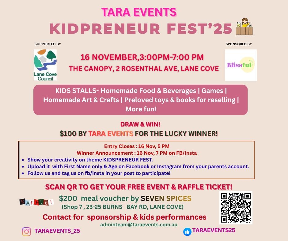 To support and harness that creativity, innovation and community spirit Tara Events is hosting the first annual Kidpreneur Fest on Sunday, 16 November from 3 pm to 7 pm in the Lane cove Canopy in collaboration with Lane Cove Council.