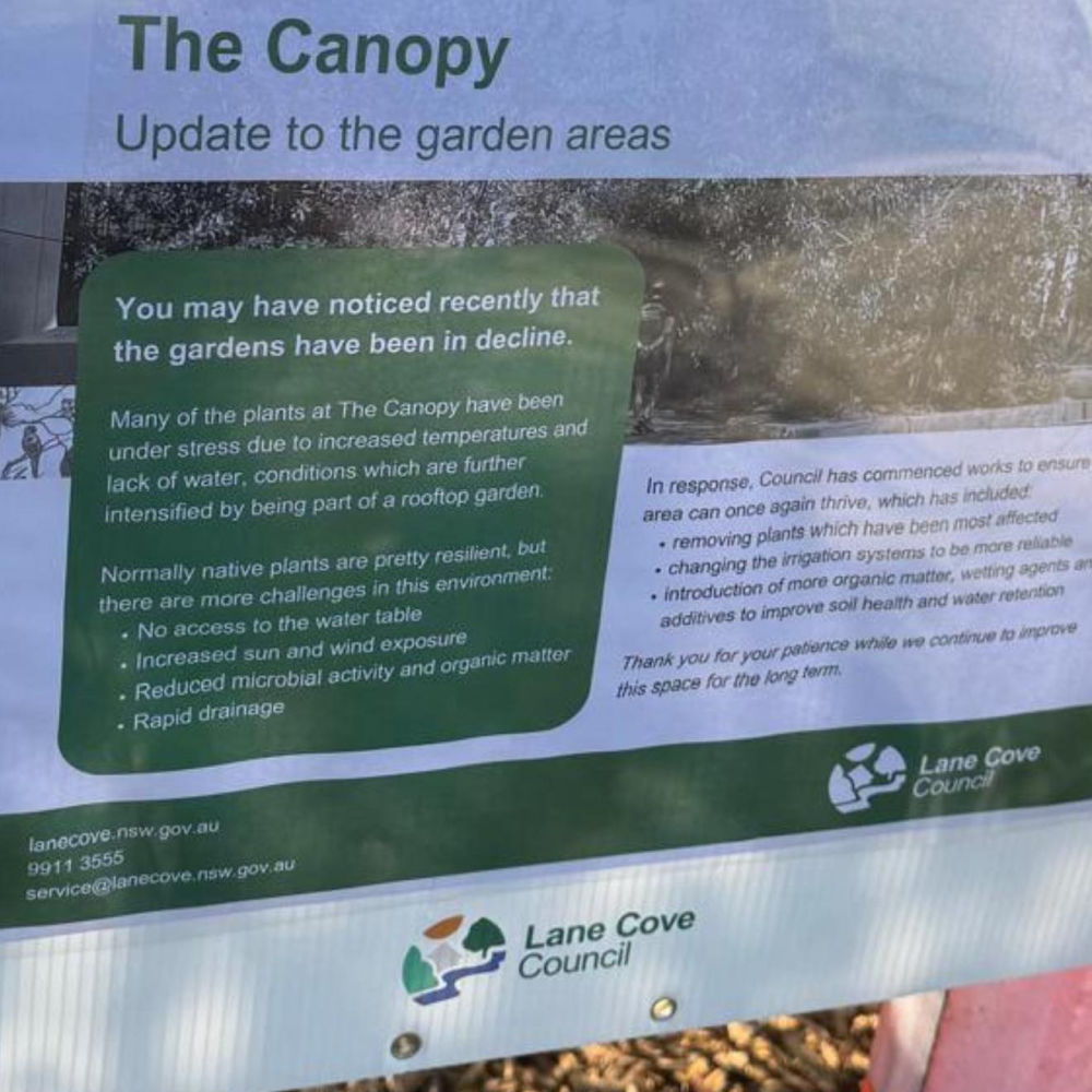 You may have noticed that some of the plants in The Canopy have been looking a bit sad lately. Lane Cove Council is taking steps to replace the plants and improve the irrigation systems for the gardens.