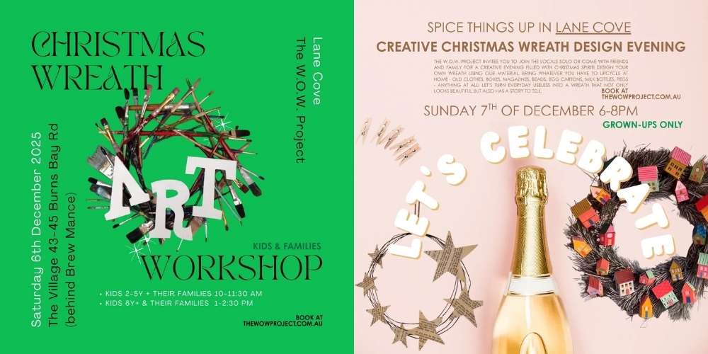Saturday 6 December – kids 2–5 & families, 10–11:30am. kids 6+ & families, 1–2:30pm. Create your own upcycled Christmas wreath. $38 per child, adults free
