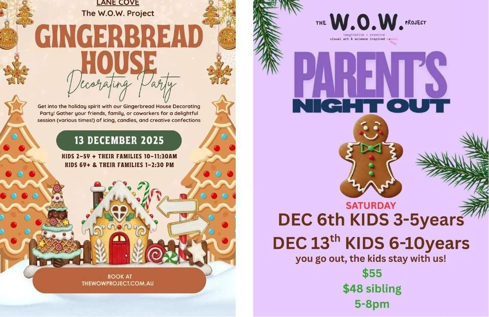 Saturday 6 December – ages 3–6, 5–8pm. Saturday 13 December – ages 7–10, 5–8pm. Healthy snacks + dinner, gingerbread house to take home. $55 per child / $48 siblings