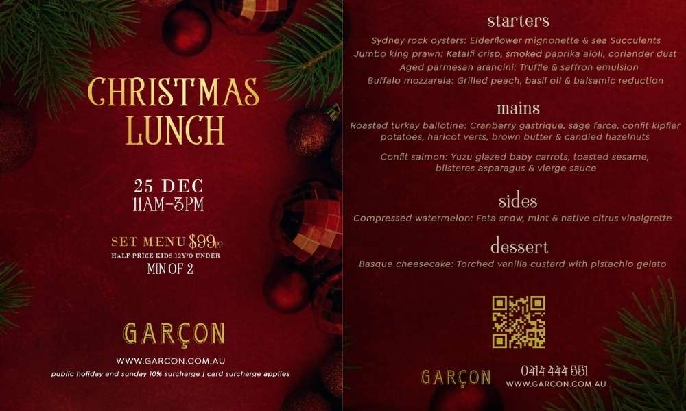 With plenty of outdoor seating at The Canopy, Garçon is perfect for long lunches, festive dinners and group celebrations. Check their website for Christmas menus and function options.