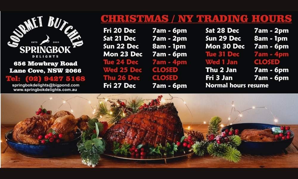 Springbok Delights in Lane Cove North offers South African-style meats, hams, turkeys and specialty products that are popular for Christmas and summer entertaining.