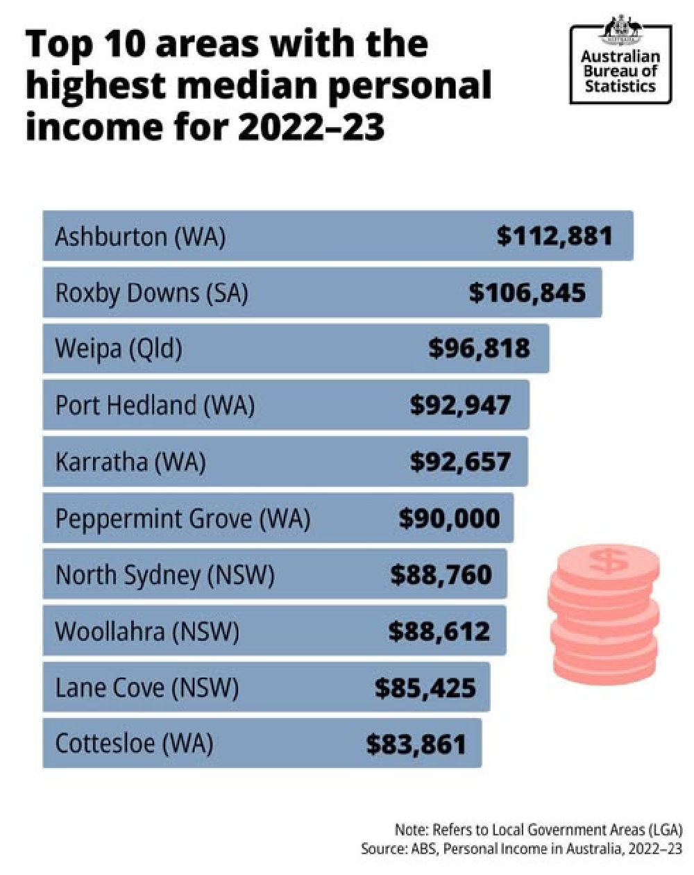 Last week, the Australian Bureau of Statistics released the top 10 areas with the highest median personal income for 2022-23. Ashburton (WA) was first on the list with $112,88.00.
