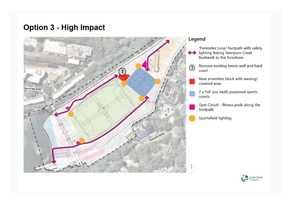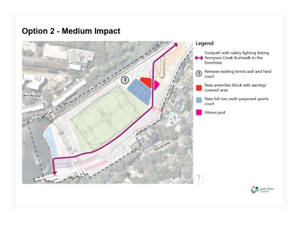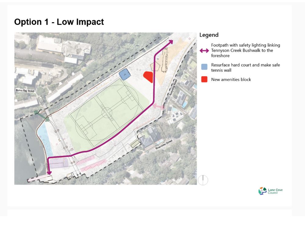 The Lane Cove Council’s Consultant has prepared a basic masterplan. They have then put together three different plans which shows that Burns Bay could be used for low impact activities up to high impact activities.