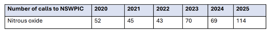 Since 2020, the NSW Poisons Information Centre has reported 114 calls about exposure to nitrous oxide – almost a 120 per cent increase from the previous year – with 80 per cent of these being hospitalised.