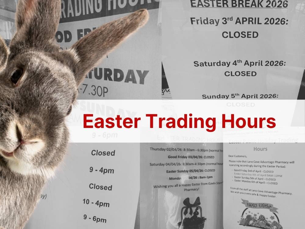The Lane Cove Newsagency will be closed on Good Friday and open on Saturday 7.00 am to 5.30 pm, Sunday 7.00 am to 2.30 pm and Easter Monday 7.30 am to 1.30 pm