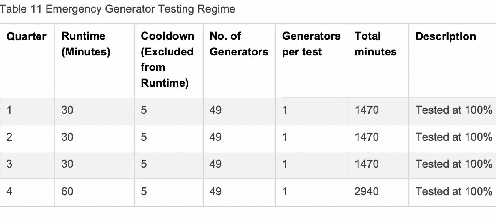 Data Centres had diesel generators for their power back ups. Their testing schedule is below: