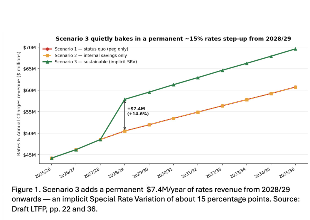 In 2028/29, Scenario 3’s Rates and Annual Charges jumps from $48.5 million to $57.9 million. This is a single-year increase of 19.3%, compared with just 4.1% in Scenario 1. That means Scenario 3 relies on roughly 15 percentage points of additional rates revenue on top of the 2028/29 rate forecasst.